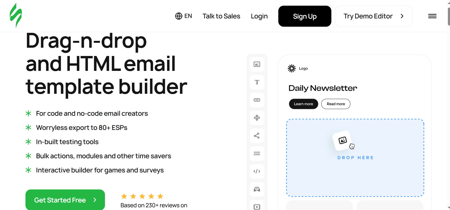Design engaging HTML email templates and export them into any mass email provider. Before we describe Stripo, we need to clarify that this isn’t a mass email service. Instead, it’s an email design tool that helps you quickly create HTML templates using a drag-and-drop editor that you can export and use on other platforms.
