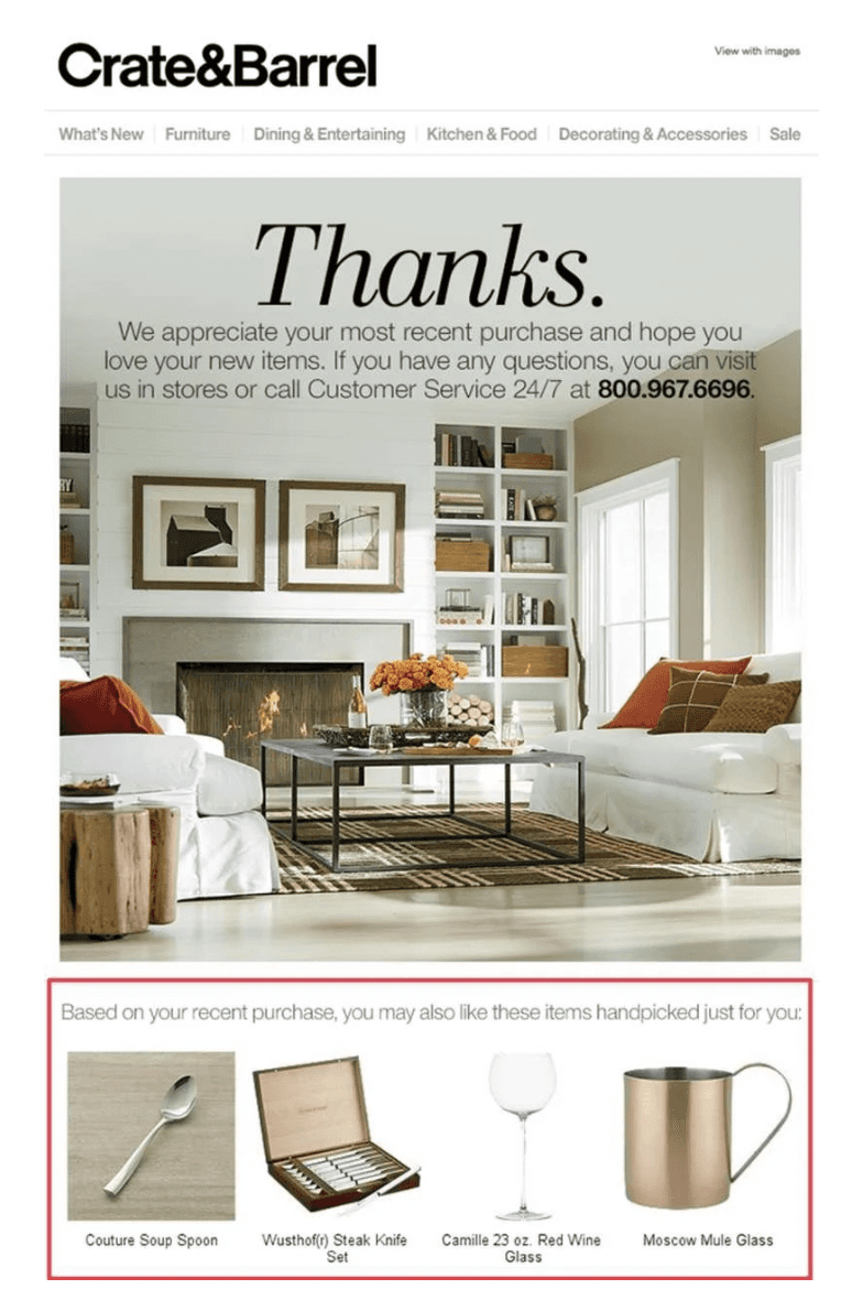A related recommendation email can be sent during the initial period after a purchase has been made. It might also be an email you send out a week or so later, along with other recent product launches that fit what this customer desires. This promotional email from Crate & Barrel is an excellent example of recommendations.