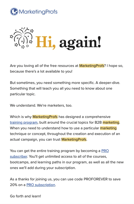 This welcome email from MarketingProfs provides the recipient with more information about the company, directs them to helpful links, explains the frequency of the newsletter, and includes a subtle call to action for those ready to upgrade to a paid plan.