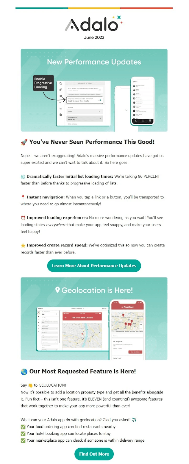 This nurture email example from Adalo introduces the app builder’s new features. It explains the benefits and links to landing pages with more information. Product update nurture email example from Adalo Source: Adalo