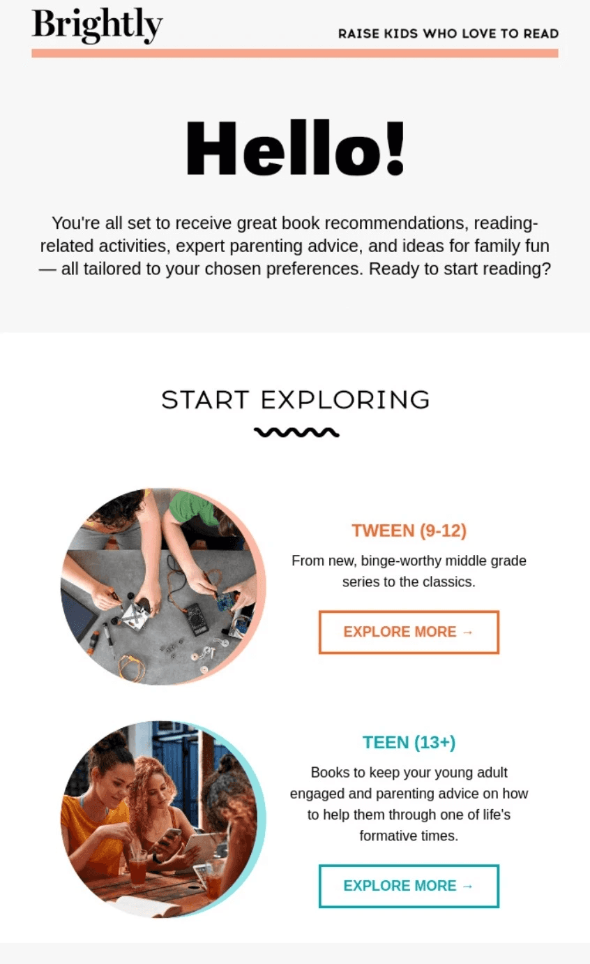 This lead nurturing example from Brightly allows families to choose between browsing books for tweens or those intended for readers aged 13 and above. If Brightly tracks which link recipients click on, it could group people based on clicks and send them relevant content.