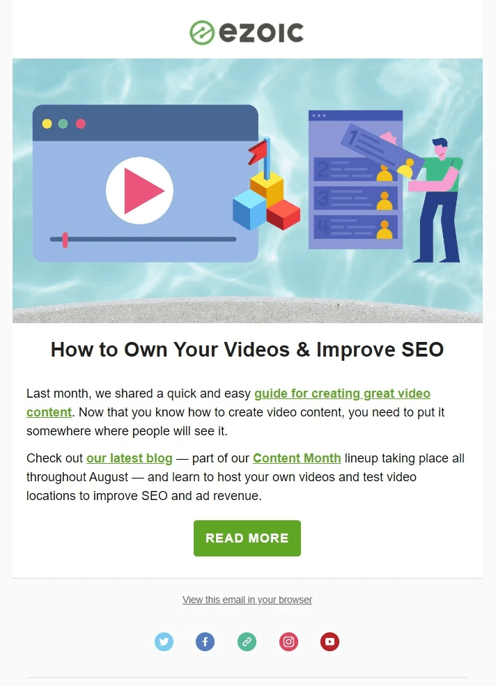 This lead-nurturing email example from Ezoic links to a blog post that shows how people can use the tool to host and display videos. The email is effective because it explains how adding videos to a website benefits the email recipient. Product explainer email example from Ezoic Source: Ezoic